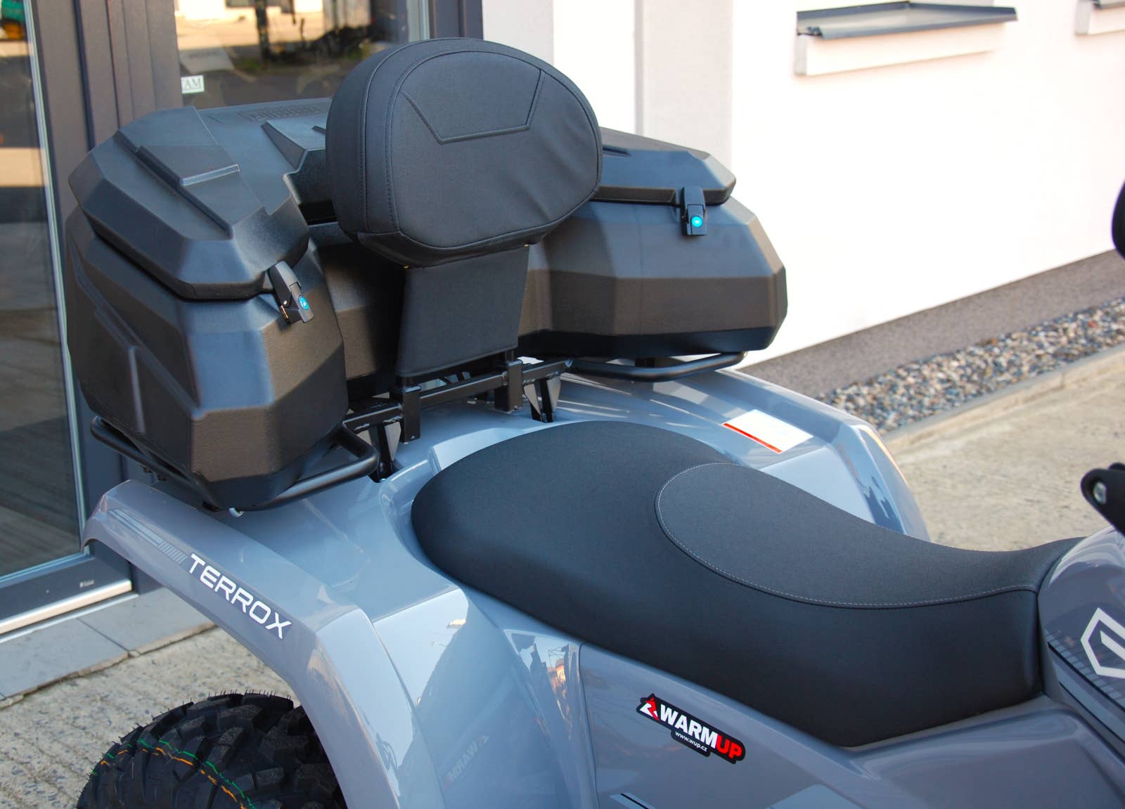 V jednoduchosti je krása. Jednoduché, spolehlivé a především nenáročné ovladače uzávěrek. Madla rukojetí jsou z měkčeného materiálu s vynikajícím gripem v případě deště či chladu. Přístrojový panel je rozdělen na 2 sektory – LCD displej a zóna barevných kontrolek. Vše jasně a přehledně v zorném poli řidiče. V nabídce je dlouhá i krátká verze. Pokud se strojem pouze pracujete, krátká verze je vhodná, pokud na čtyřkolce jezdíte v tandemu, dlouhá verze poskytuje daleko větší komfort posádce. Přední i zadní ocelové nosiče tohoto systému nabízejí pohodlné řešení pro přepravu různých předmětů. S jednoduchým kotvícím systémem lze snadno připevnit doplňky, jako jsou boxy nebo další náklad, a zajistit je v bezpečném stavu. Lano navijáku operuje bezpečně v horizontálních a vertikálních rolnách, navíc je tento technický prvek dobře chráněn předsunutým rámem. Ovládání navijáku je elektronické z řídítek stroje. Homologované tažné zařízení je prirozenou součástí pracovního zařazení Terroxu. Je odnímatelné, což umožňuje v případě potřeby připojit jiný typ pracovního zařízení, příklad je sběrný koš na ovoce.